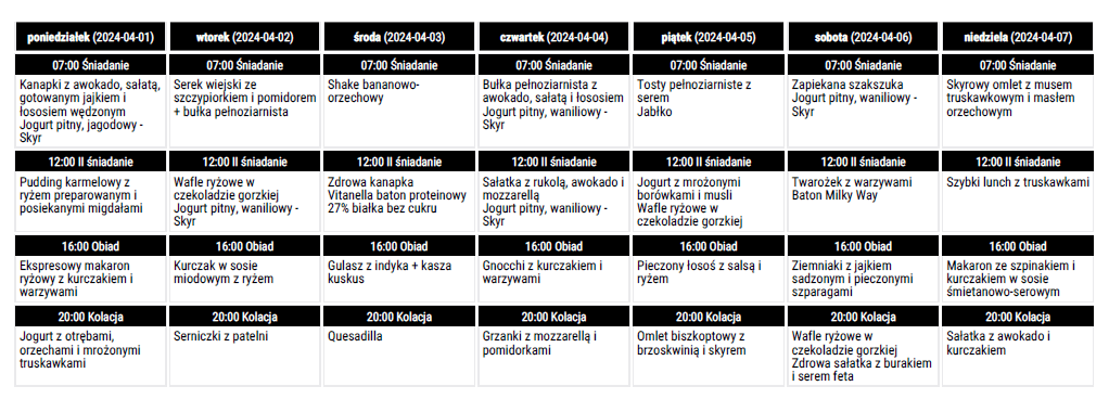 – W jadłospisie są podane wszystkie wykorzystane produkty co ułatwi zakupy.
